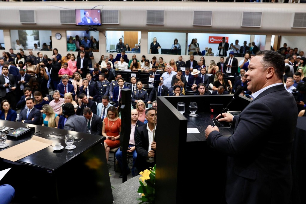 Durante a posse da Mesa Diretora da Assembleia Legislativa de Mato Grosso (biênio 2025/2027), na manhã desta segunda-feira (3), em Cuiabá, o prefeito de Rondonópolis,