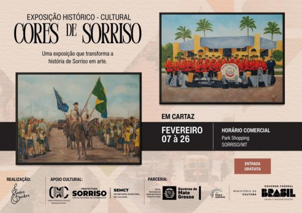 A trajetória de Sorriso, desde os primeiros registros até os dias atuais, ganha nova leitura artística na exposição “Cores de Sorriso”, aberta ao público no Shopping Sorriso. A mostra começou no sábado (7) e segue até 28 de fevereiro de 2026, com entrada gratuita.