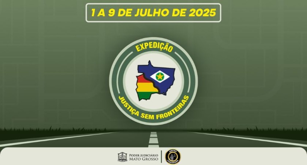 #PraTodosVerem: A imagem anuncia a “Expedição Justiça Sem Fronteiras”, que ocorrerá de 1º a 9 de julho de 2025. No centro, há um selo com os mapas do estado de Mato Grosso e da Bolívia sobrepostos, simbolizando a atuação transfronteiriça. O fundo remete a uma estrada, reforçando a ideia de deslocamento e acesso à justiça em regiões remotas. Na parte inferior, aparecem os logotipos do Poder Judiciário de Mato Grosso e da Justiça Comunitária.