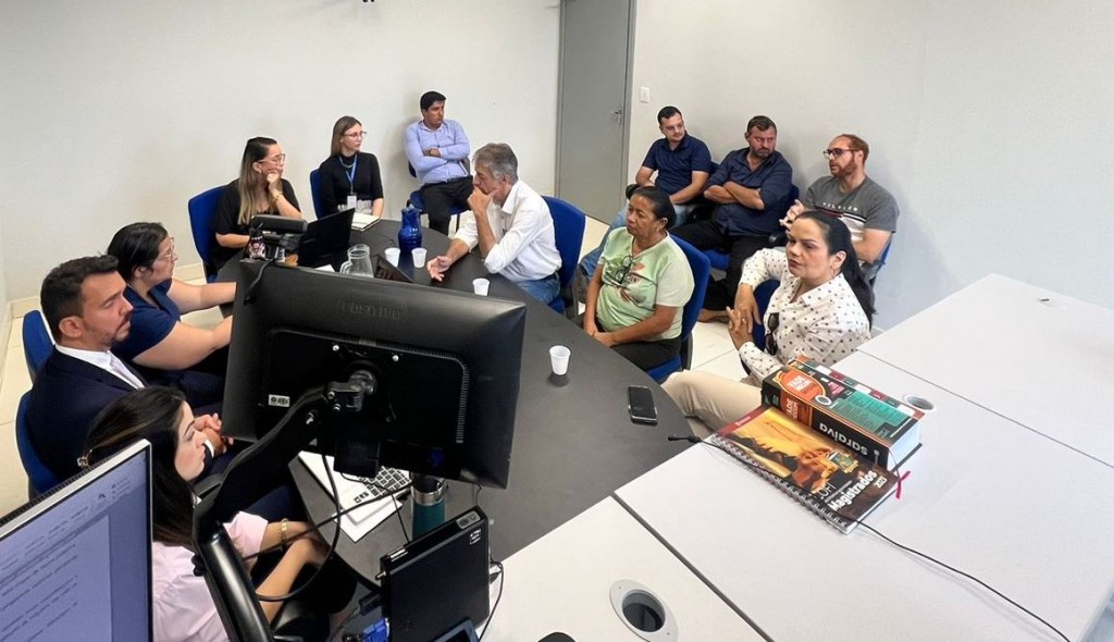 #ParaTodosVerem: esta matéria inclui recursos de texto alternativo para promover a inclusão de pessoas com deficiência visual. Foto colorida da sala de audiência que trata do processo estruturante em Ribeirão Cascalheira, no Fórum da comarca. A magistrada está na ponta da mesa e ouve um dos representantes das entidades.