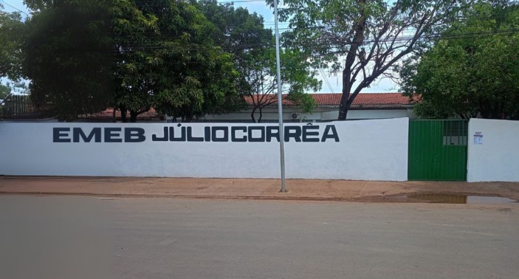#PraTodosVerem – A imagem mostra a fachada da Escola Municipal de Ensino Básico (EMEB) Júlio Corrêa, em Várzea Grande, identificada por uma parede branca com o nome da instituição pintado em letras grandes e pretas. Ao lado direito há um portão verde de acesso, e ao fundo é possível ver árvores e parte do telhado da escola municipal, localizada no bairro São Mateus.