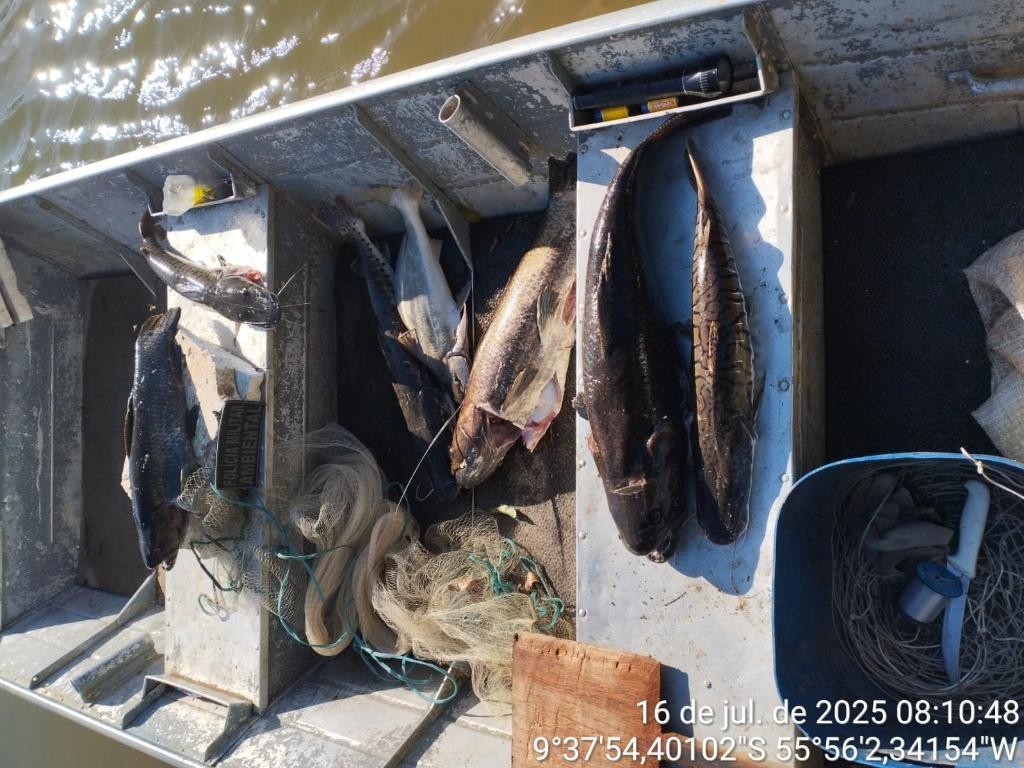 As equipes localizaram um saco branco contendo sete peixes das espécies cachara, barbado e trairão, totalizando 25 kg de pescado. Além disso, os policiais encontraram uma arma de fogo, um tarrafão utilizado para a prática ilegal da pesca e outros petrechos.