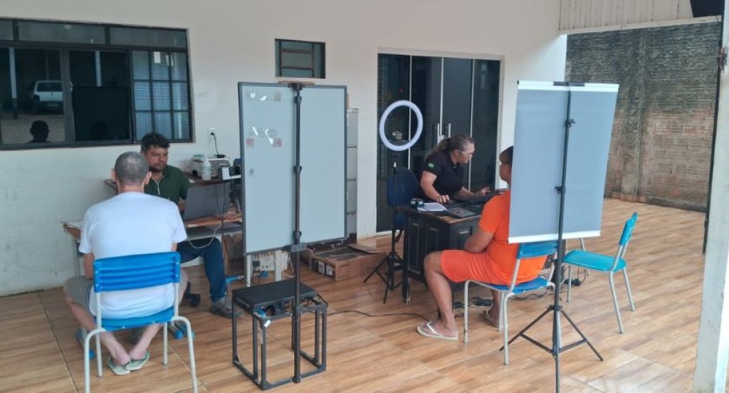 #PraTodosVerem – A imagem mostra uma cena de atendimento biométrico da Justiça Eleitoral em uma área externa. Nela, há quatro pessoas no total: duas pessoas sentadas de frente para as mesas onde estão outras duas pessoas, operando computadores. Painéis verticais cinzas, possivelmente telas de privacidade ou fundos de fotografia/vídeo, estão posicionados entre os atendentes e os que esperam/estão sendo atendidos. Um ring light pode ser visto preso à mesa da mulher.