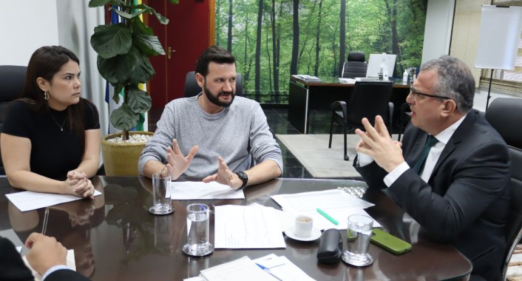 #PraTodosVerem: A primeira imagem mostra uma reunião entre três pessoas — uma mulher e dois homens — sentadas ao redor de uma mesa em um ambiente corporativo. Eles estão em uma conversa ativa, com gestos que indicam diálogo e troca de ideias. A mesa está organizada com papéis, copos de água, uma xícara de café e objetos de uso pessoal. Ao fundo, há um painel com imagem de floresta, móveis de escritório e bandeiras, compondo um espaço institucional moderno e bem estruturado. A segunda imagem mostra a coleta biométrica do prefeito sendo feita, na sala onde ocorreu a reunião.