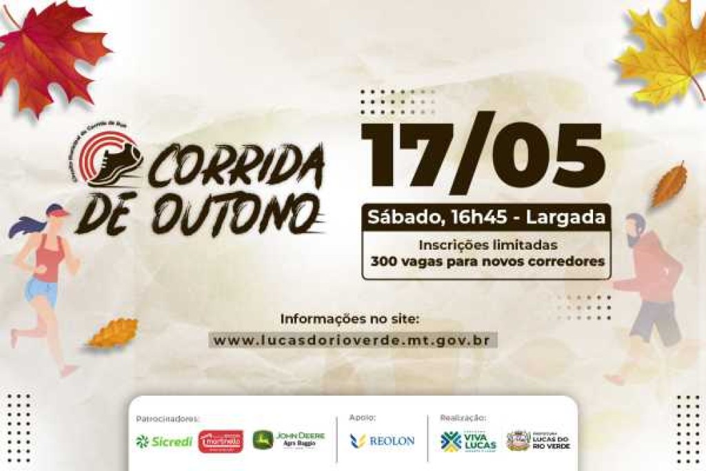 Estarão abertas a partir desta quarta-feira (30), às 19h, as inscrições para a segunda etapa de Corridas de Rua – Corrida de Outono de Lucas do Rio Verde. São ofertadas 300 novas vagas para corrida destinada a moradores do município.