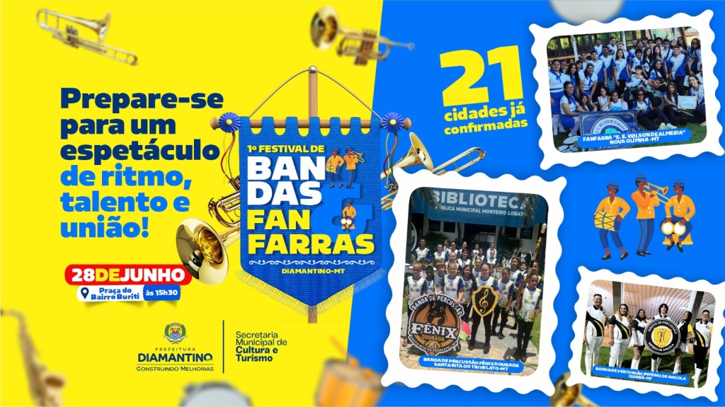 A Prefeitura de Diamantino, por meio da Secretaria Municipal de Cultura e Turismo, realizará no próximo dia 28 de junho (sábado), a partir das 15h30, na Praça do Ginásio Poliesportivo do bairro Buriti, o 1º Festival de Bandas e Fanfarras do município.