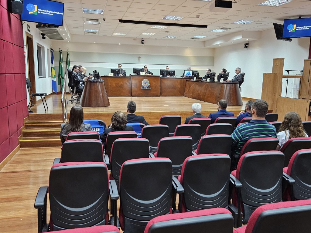 #PraTodosVerem: Foto em que aparece o Plenário do TRE-MT, com os juízes-membros sentados na parte de cima, na sessão de encerramento da Sessão Plenária da eleição. De frente para eles, estão algumas pessoas, que assistem à sessão, sentados nas cadeiras do Plenário.