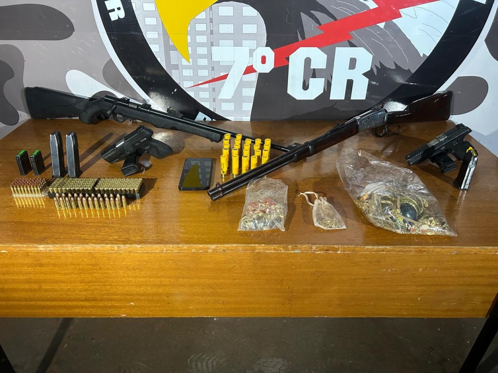 Os policiais se deslocaram até o ponto indicado pelo suspeito, sendo uma região de mata, e encontraram duas pistolas, um rifle e uma carabina. No mesmo local, foram encontradas cerca de 200 munições para o armamento.