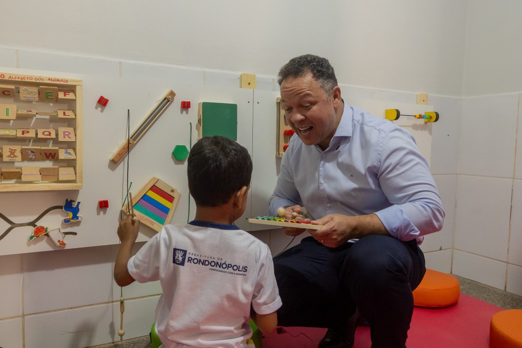 Aluno da rede municipal de ensino com o prefeito Claudio Ferreira na sala multisensorial | Ednilson Aguiar - Gabinete de Comunicação