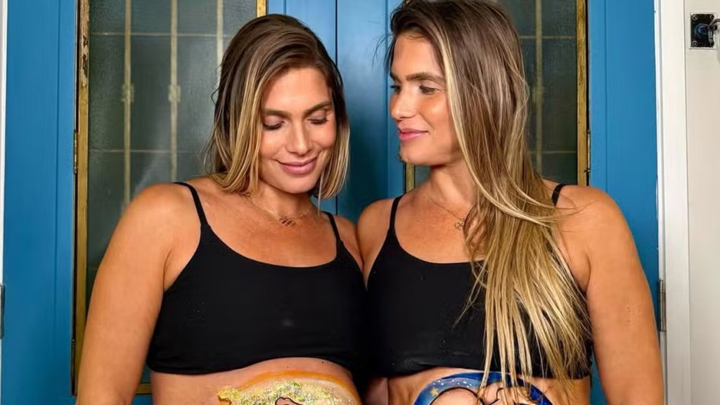 Bia e Branca Feres, gêmeas do nado sincronizado, mostraram nas redes sociais as barrigas pintadas por Juliana Coelho e celebraram a coincidência de estarem grávidas ao mesmo tempo. As gestações, não planejadas, têm três meses de diferença, e ambas esperam meninos o de Branca chega ainda em 2025, já de Bia no início de 2026.