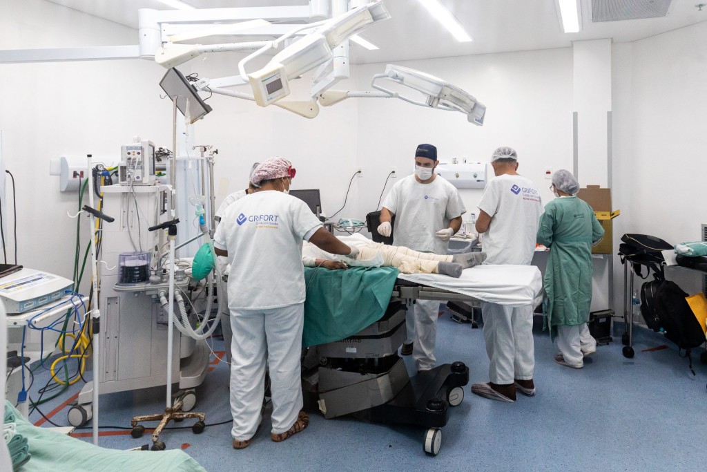 A imagem mostra uma equipe médica completa durante um procedimento cirúrgico. Todos os profissionais estão usando roupas adequadas ao ambiente hospitalar.