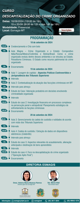 Descrição da imagem: Peça publicitária colorida e horizontal. Na parte superior está imagem de uma plataforma de madeira, com três livros empilhados e uma algema. Texto: Curso Descapitalização do Crime Organizado. Data: 18/09/2024 (15h30 às 19h), 19 e 20/09 (8h30 às 12h e das 14h às 18h). Modalidade: presencial, Local Esmagis-MT. Abaixo programação. No final da peça estão as fotos da dessa Helena Maria Bezerra Ramos (diretora-geral da Esmagis-MT) e des. Márcio Vidal (vice-diretor-geral). As peças são assinadas pelos logos do Poder Judiciário de Mato Grosso, da Esmagis e da Polícia Civil.