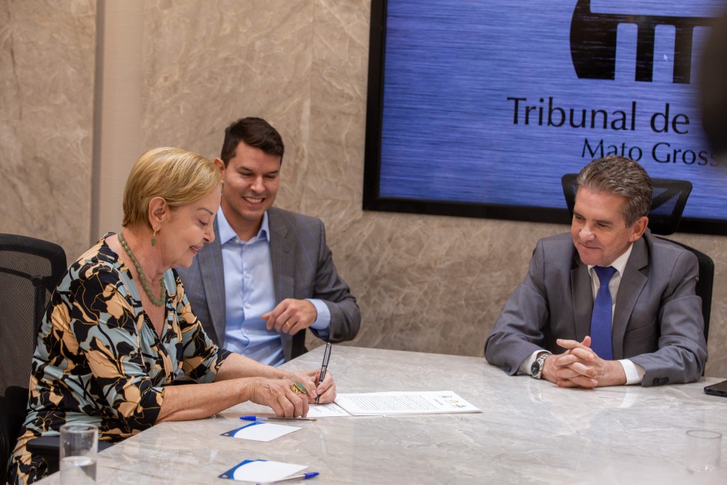 A formalização do contrato ocorreu na tarde desta terça-feira (29 de outubro), na Presidência do TCE-MT. Assinaram a presidente do TJMT, desembargadora Clarice Claudino da Silva; os presidentes do TCE-MT e do MPMT, respectivamente, conselheiro de contas Sérgio Ricardo de Almeida e procurador-geral da Justiça Deosdete Cruz Júnior.