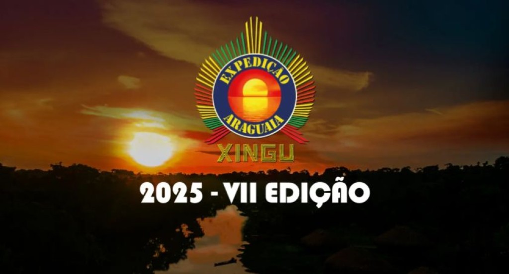 #PraTodosVerem – A imagem mostra um pôr do sol sobre um rio cercado por vegetação, com o logotipo colorido da “Expedição Araguaia-Xingu” em destaque ao centro. Abaixo do símbolo, aparece a inscrição “2025 – VII Edição”, indicando a realização da sétima edição do evento neste ano.