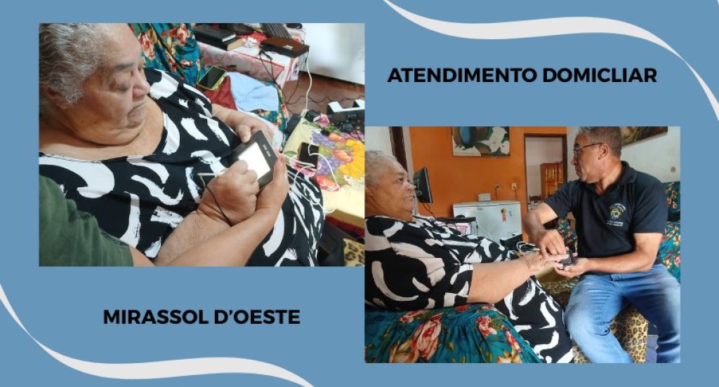 #PraTodosVerem: A imagem mostra um atendimento domiciliar da Justiça Eleitoral em Mirassol D’Oeste. Em duas fotos, uma mulher idosa é assistida por um servidor que coleta seus dados com equipamentos eletrônicos. O material destaca a ação voltada para garantir o acesso ao serviço mesmo fora do cartório.