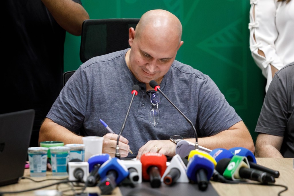 A foto ilustra o prefeito Abilio Brunini, sentado numa cadeira de cor preta, e apoiado numa mesa de madeira, assinando um documento à caneta. Na mesa, estão microfones de veículos de comunicação de imprensa e copos de água descartáveis.