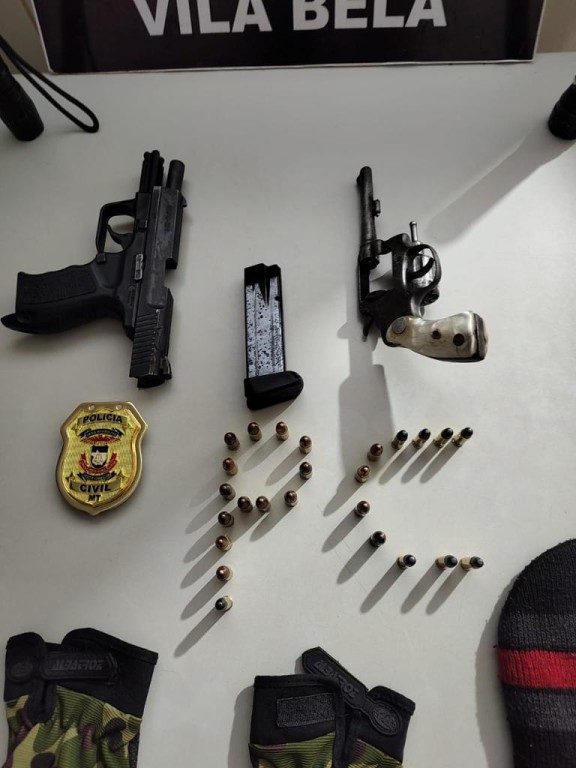 A Delegacia da Polícia Civil de Vila Bela da Santíssima Trindade (520 km de Cuiabá) prendeu, nesta terça-feira (12.8), um homem, de 25 anos, durante buscas a suspeitos de estarem na cidade para cometer um homicídio. Com o preso foram encontradas armas, munições e apetrechos.