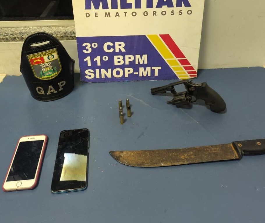 Durante buscas pelo cativeiro, os policiais militares apreenderam um revólver calibre .38, cinco munições, um facção e dois aparelhos celulares. Os suspeitos foram encaminhados à delegacia para registro do boletim de ocorrência.