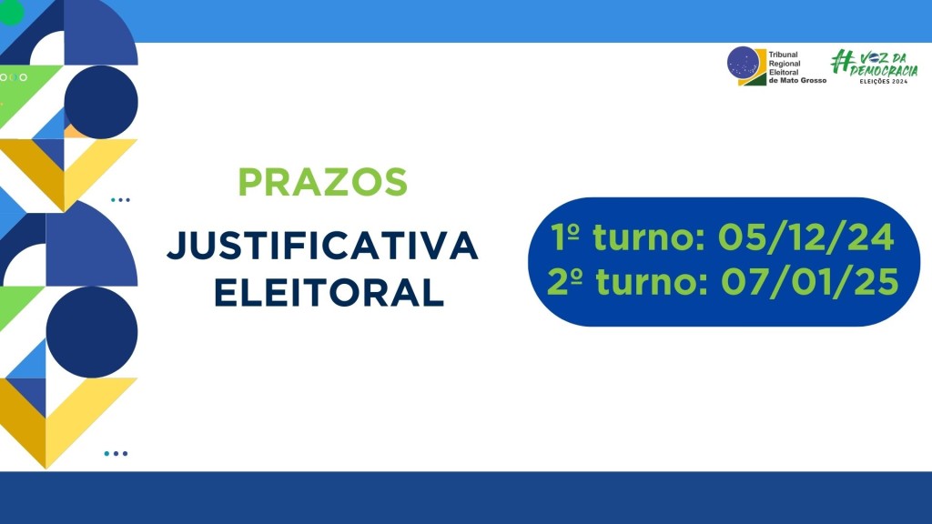 #PraTodosVerem: Imagem com fundo branco, duas faixas azuis nas partes superior e inferior e detalhes de formas geométricas coloridas no canto esquerdo. No centro, está escrito PRAZOS – JUSTIFICATIVA ELEITORAL e tem as datas. No canto superior direito, estão as marcas do TRE-MT e das Eleições de 2024.