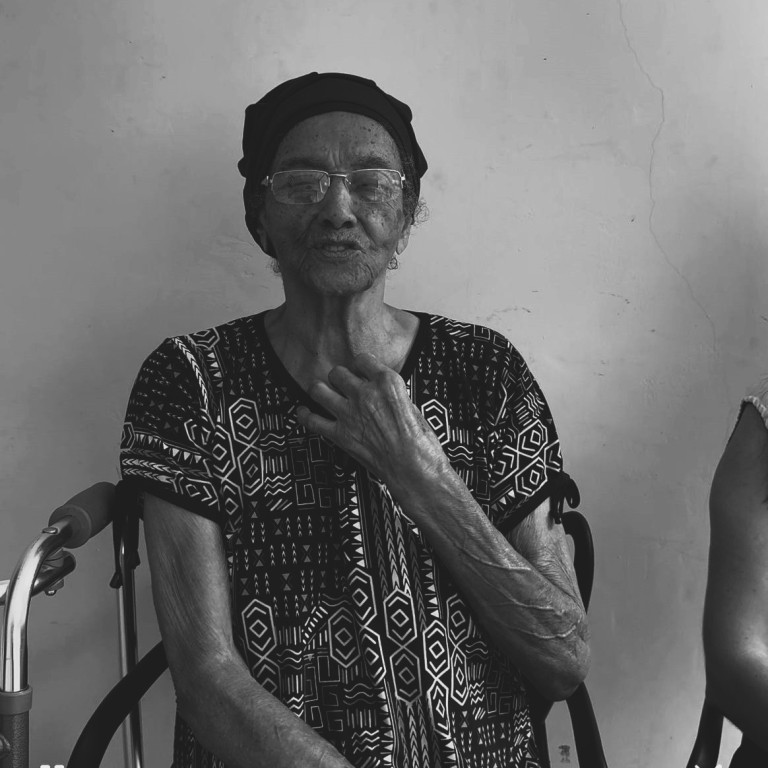 A imagem mostra um retrato em preto e branco da dona Jacinta Martins Santana. Ela esta sentada em uma cadeira e usa um lenço no cabeça.