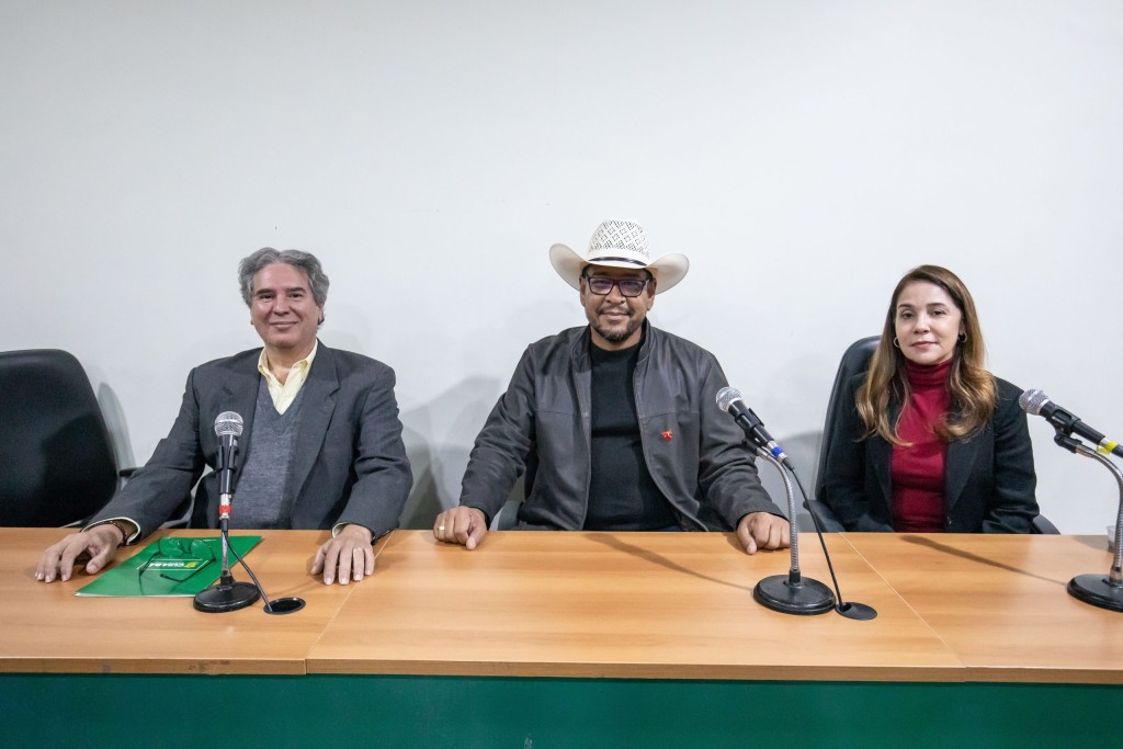 A foto mostra três pessoas sentadas em cadeiras pretas e apoiadas em uma mesa de madeira. À esquerda, está o secretário de Planejamento, Nivaldo Carvalho; no centro, o secretário de Cultura, Johnny Everson; e, à direita, a secretária-adjunta de Planejamento, Silvina Maria dos Anjos.