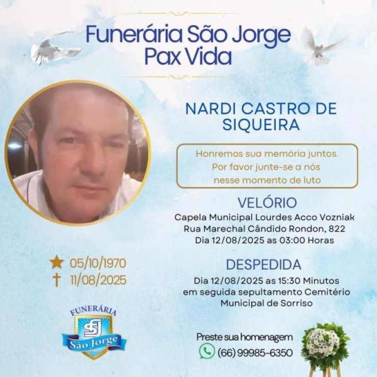 A Prefeitura, em especial a Secretaria de Infraestrutura, Transporte e Saneamento (Sintra), se solidariza à família, aos amigos e colegas do servidor terceirizado Nardi Castro de Siqueira, que faleceu nesta segunda-feira (11 de agosto), vítima de um infarto.