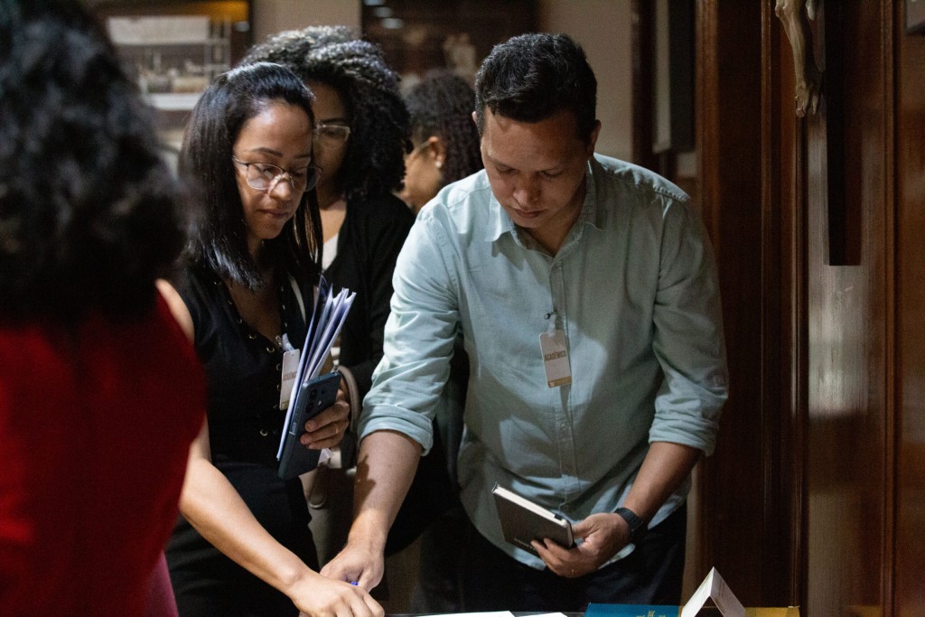 “Desde criança eu venho alimentando esse sonho da magistratura, hoje dou continuidade a ele através da dedicação aos meus estudos no direito”, contou Rosane. #Paratodosverem. Esta matéria possui recursos de texto alternativo para inclusão das pessoas com deficiência visual. Descrição da imagem – Foto 1: Alunos assinam livro de presença no Espaço Memória. Foto 2: alunos em pé no Espaço Memória atentos às palestras. Foto 3: juiz Túlio entrega um glossário jurídico para o aluno Lucas Salvaterra no Espaço Memória. Foto 04: Rosane Conceição Rodrigues Felipe Gomes sendo entrevistada para a TV JUS.