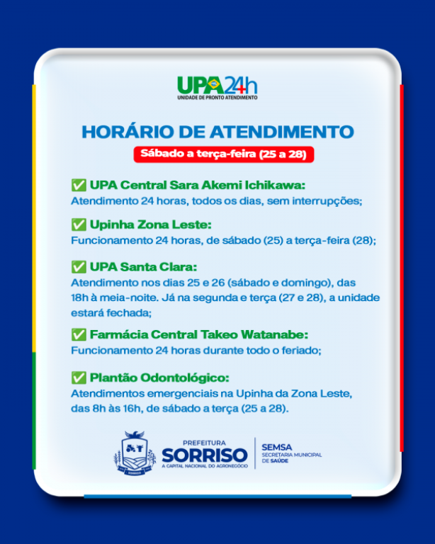 ✅ UPA Santa Clara: atendimento nos dias 25 e 26 (sábado e domingo), das 18h à meia-noite. Já, na segunda e terça (27 e 28), a unidade estará fechada;