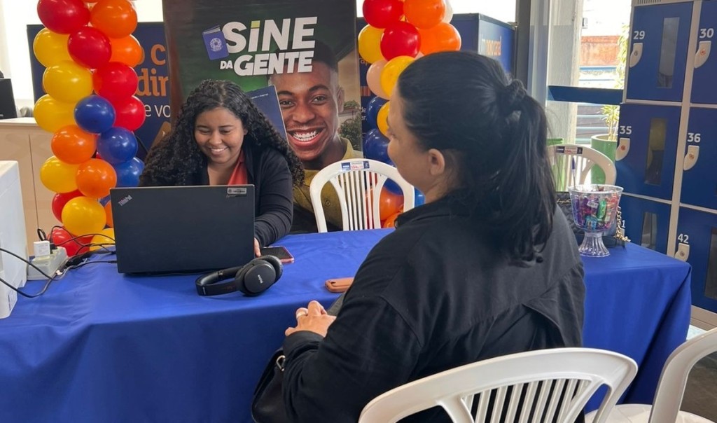 A imagem mostra uma mesa forrada com toalha azul marinho, na qual uma pessoa recebe atendimento. Ao fundo se destaca um banner do Sine gente emuldurada por balões coloridos..