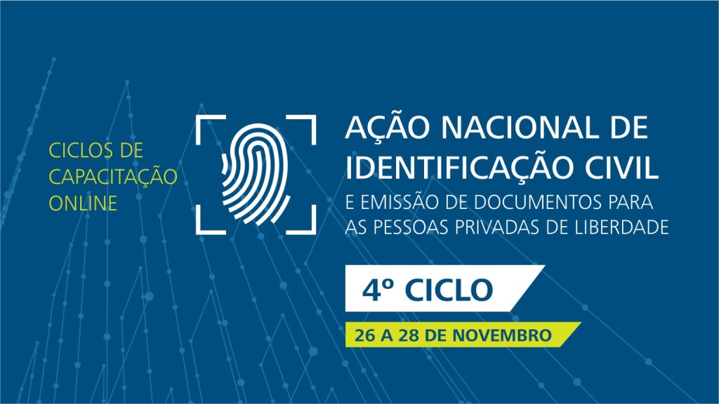 #Paratodosverem. Esta matéria possui recursos de texto alternativo para promover a inclusão de pessoas com deficiência visual. Descrição da imagem: arte gráfica digital de fundo azul, à esquerda escrito Ciclos de capacitação online em amarelo, ao lado uma imagem de uma digital com um contorno em volta, ao centro o texto “Ação Nacional de Identificação Civil e emissão de documentos para as pessoas privadas de liberdade”. 4º ciclo 26 a 28 de novembro.