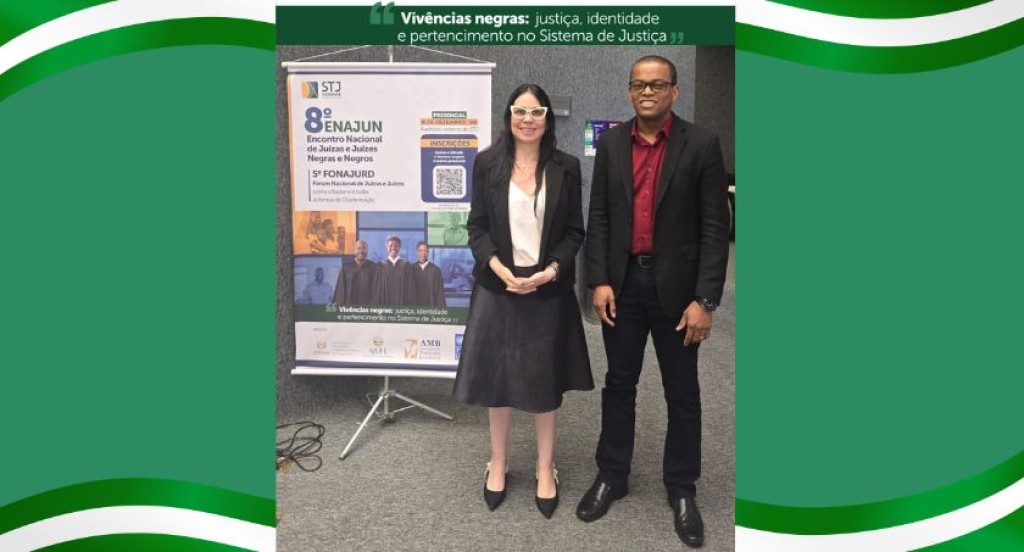 #PraTodosVerem: A imagem mostra duas pessoas posando para a foto em frente a um banner do 8º ENAJUN e 5º FONAJURD, eventos realizados pelo STJ. Ao fundo, vê-se o painel do evento, e o banner destaca informações sobre o encontro. Ambos estão vestidos de forma formal e sorriem levemente para a câmera.