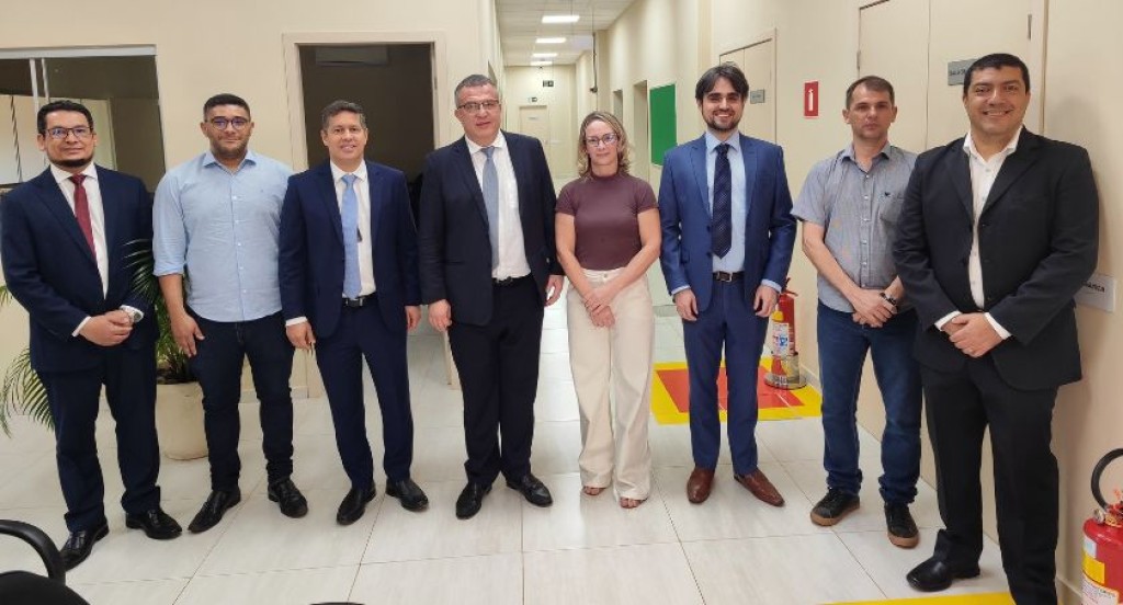 #PraTodosVerem: A imagem mostra um grupo de nove pessoas posando para uma foto em um corredor institucional, com portas identificadas e extintores visíveis ao fundo. Os participantes estão vestidos formalmente, a maioria em trajes sociais, sugerindo um encontro oficial ou visita técnica. O ambiente é bem iluminado, com piso claro e aparência organizada, reforçando o caráter profissional do momento registrado.