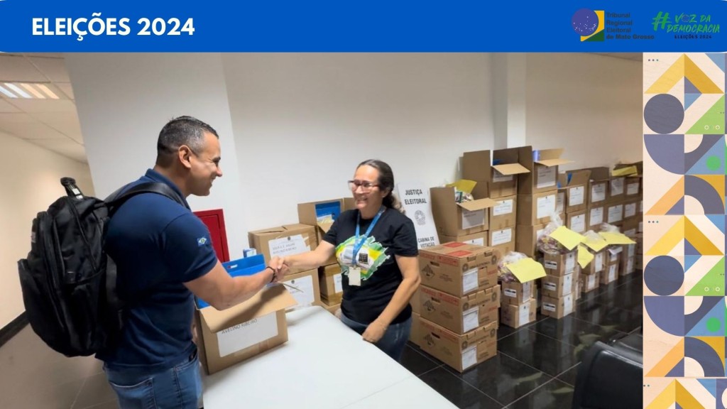 #DescriçãodaImagem: Nela se vê uma faixa azul escuro na parte superior com a escrita Eleições 2024. Abaixo a foto onde se vê uma servidora entregando um kit ao coordenador de local de votação, eles estão sorrindo e se cumprimentando. Na lateral à direita vários quadriculados coloridos.