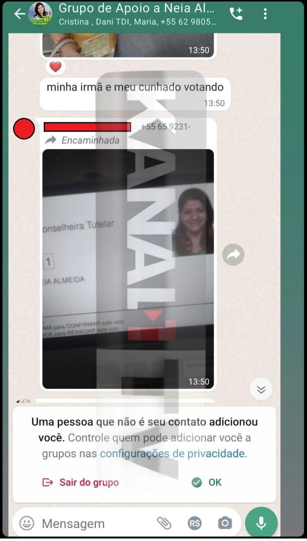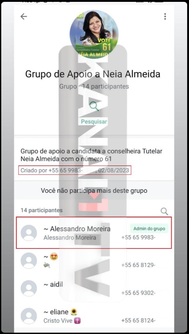 O jornalista Arthur Garcia, recebeu algumas denúncias que envolvem o vereador por Várzea Grande, Alessandro Moreira (PP). Segundo Garcia, o vereador criou um grupo no WhatsApp para apoiar uma candidata a vaga de conselheira tutelar do município. O grupo foi denominado como: “Grupo de apoio à Neia Almeida” que contou com 14 participantes e dentre eles assessores do vereador, a própria candidata, Neia almeida e servidores da educação do município com cargo na Creche “Brigida Maria Costa Marques”. É possível verificar na denúncia prints que comprovam a criação do grupo e interação das pessoas envolvidas, e o mais grave, no dia da eleição que ocorreu no dia 01/10, os participantes do grupo enviaram fotos da urna eletrônica comprovando a efetivação do voto na candidata Neia Almeida que foi eleita com 611 votos.