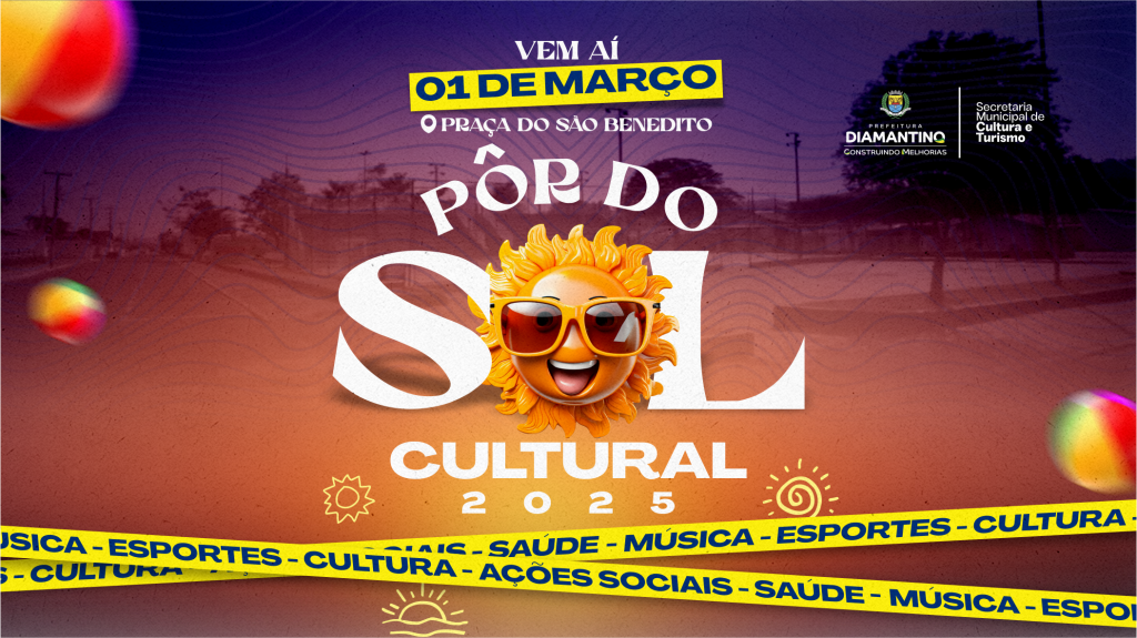 Pensando em proporcionar integração e lazer à população diamantinense, no dia 1º de março, a Prefeitura de Diamantino, por meio da Secretaria Municipal de Cultura e Turismo, promoverá o Pôr do Sol Cultural, um evento dedicado à uma tarde de convivência ao ar livre, reunindo música e esporte para todas as idades. O festival será realizado a partir das 16h na Praça São Benedito e reunirá atrações culturais, musicais, esportivas e diversas ações sociais, ambientais e de saúde.